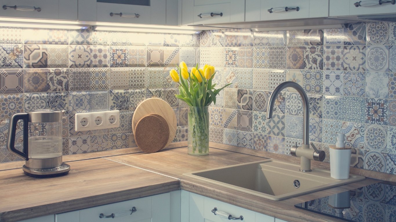 Kitchen: Use backsplash tiles to add color and protect your walls. Large floor tiles keep the space clean and airy.